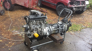 The front drive shaft would not rotate. The drive train was VERY greasy so it could use new gaskets and seals. The clutch inspection plate is missing and it is very greasy and dirty in that area.